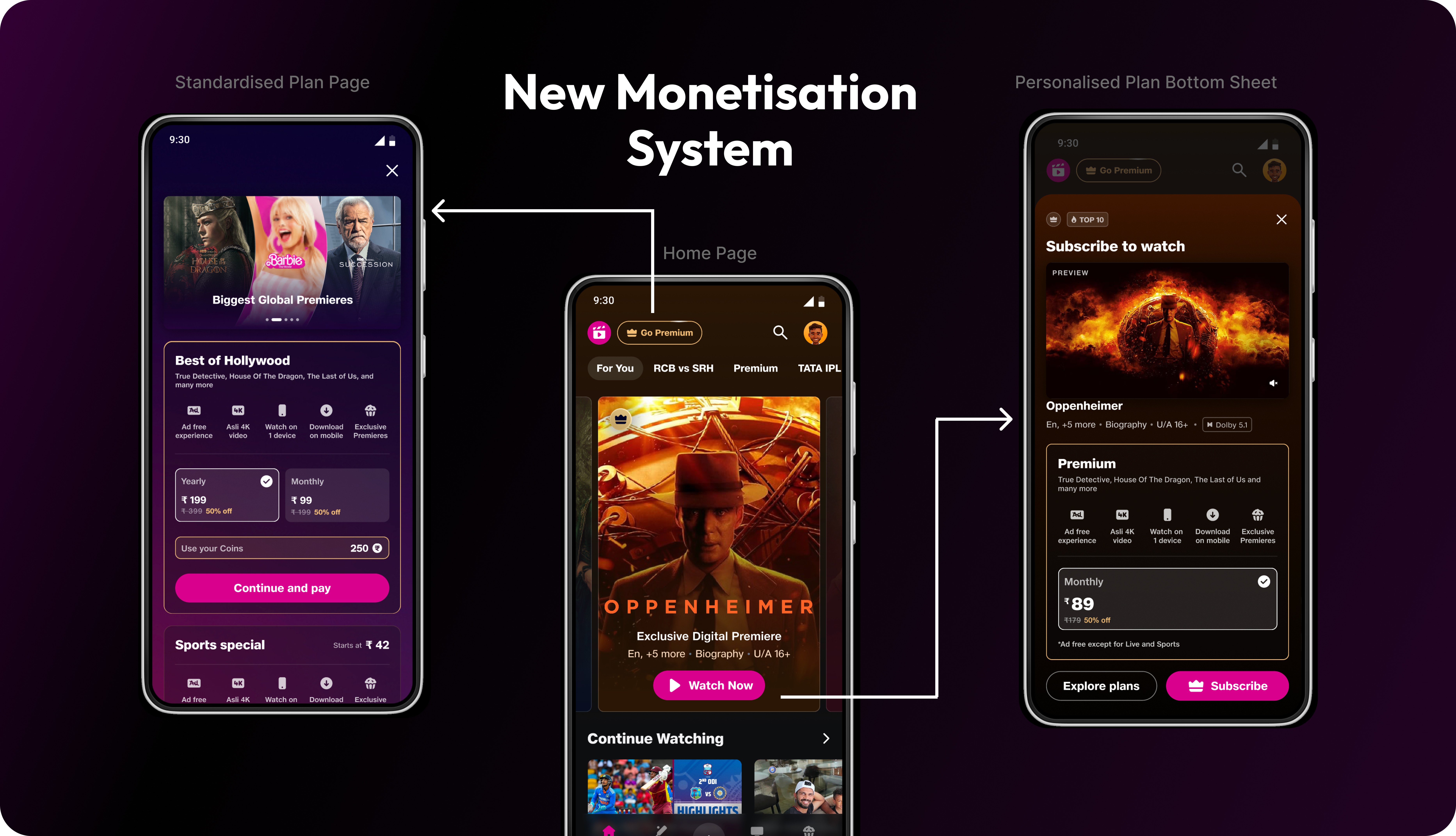 Revamp the "Premium positioning" with new branding, Ui revamp, strategic exclusive personalised plans build to promote customer retention and loyalty along with a modular internal Ui structure which can give flexibility to the business team to test and experiment with different plans. Basically creating a new subscription ecosystem that could scale across content types, pricing models and devices.