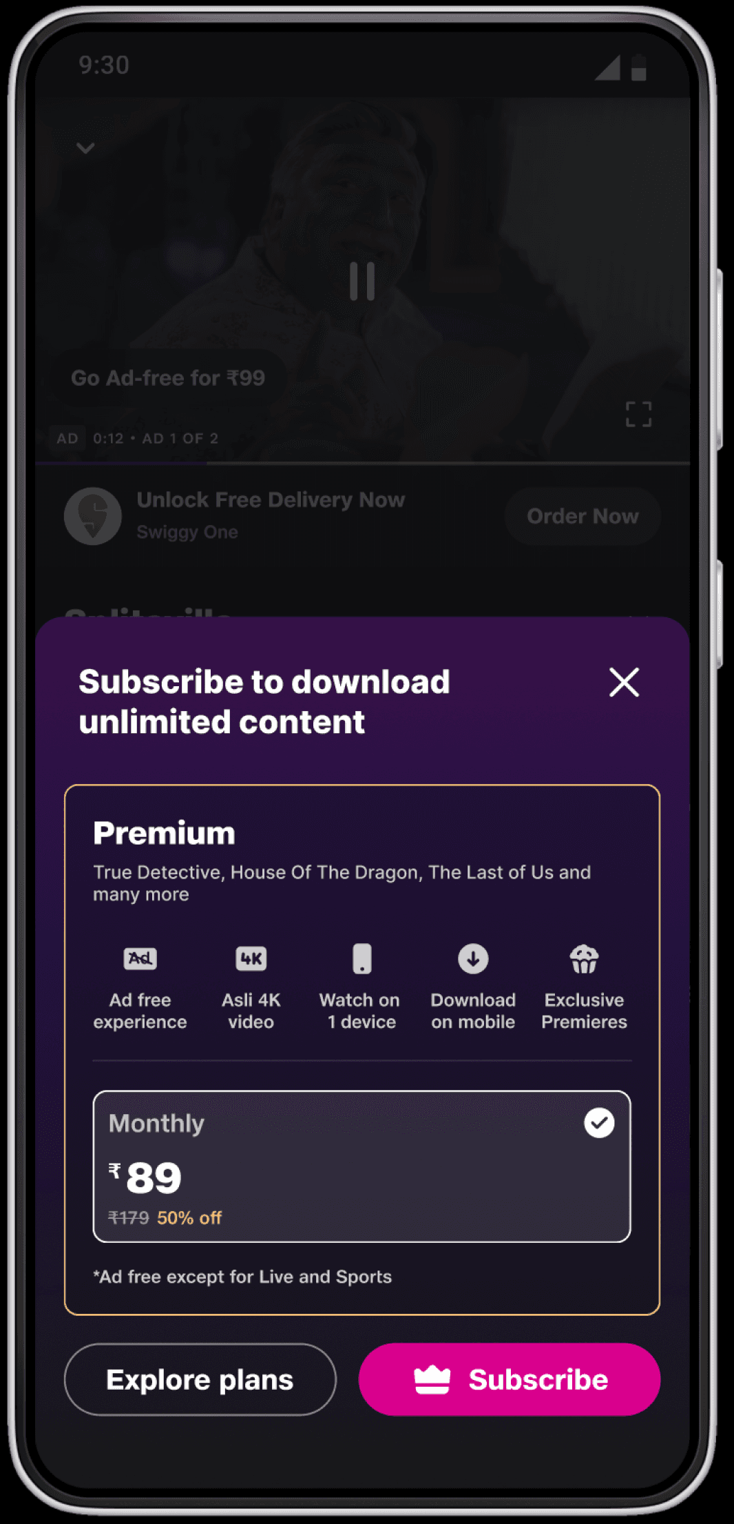 Improved discoverability and uptake of premium and ads-free plans through contextual upsell.