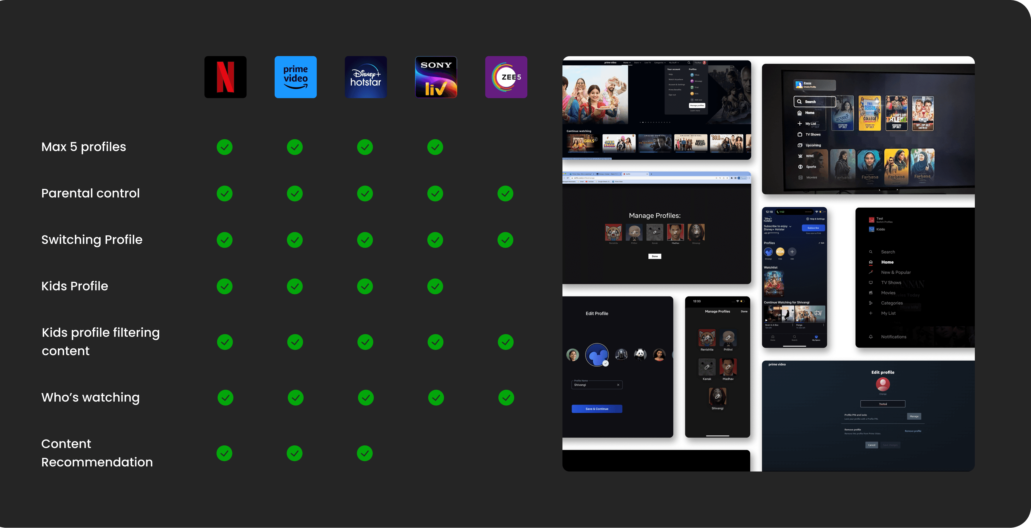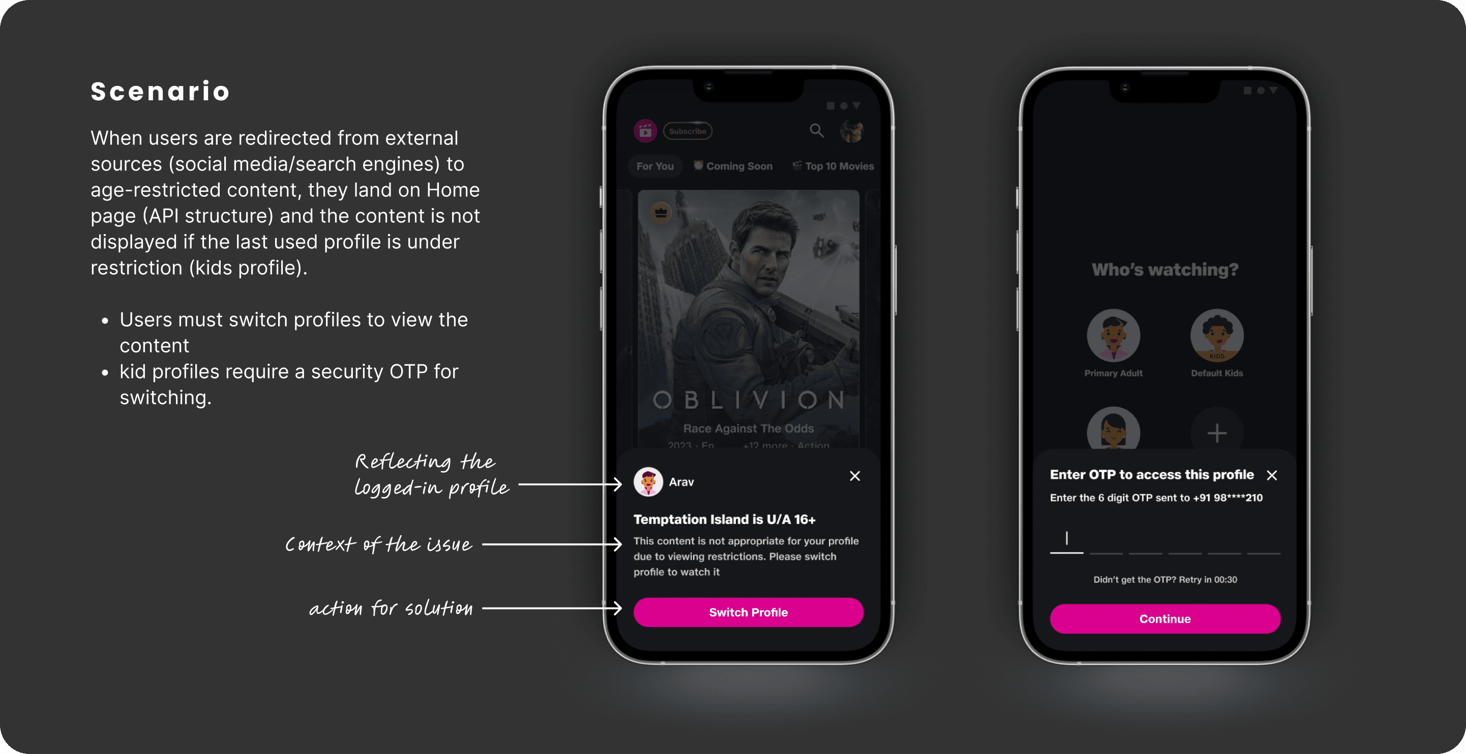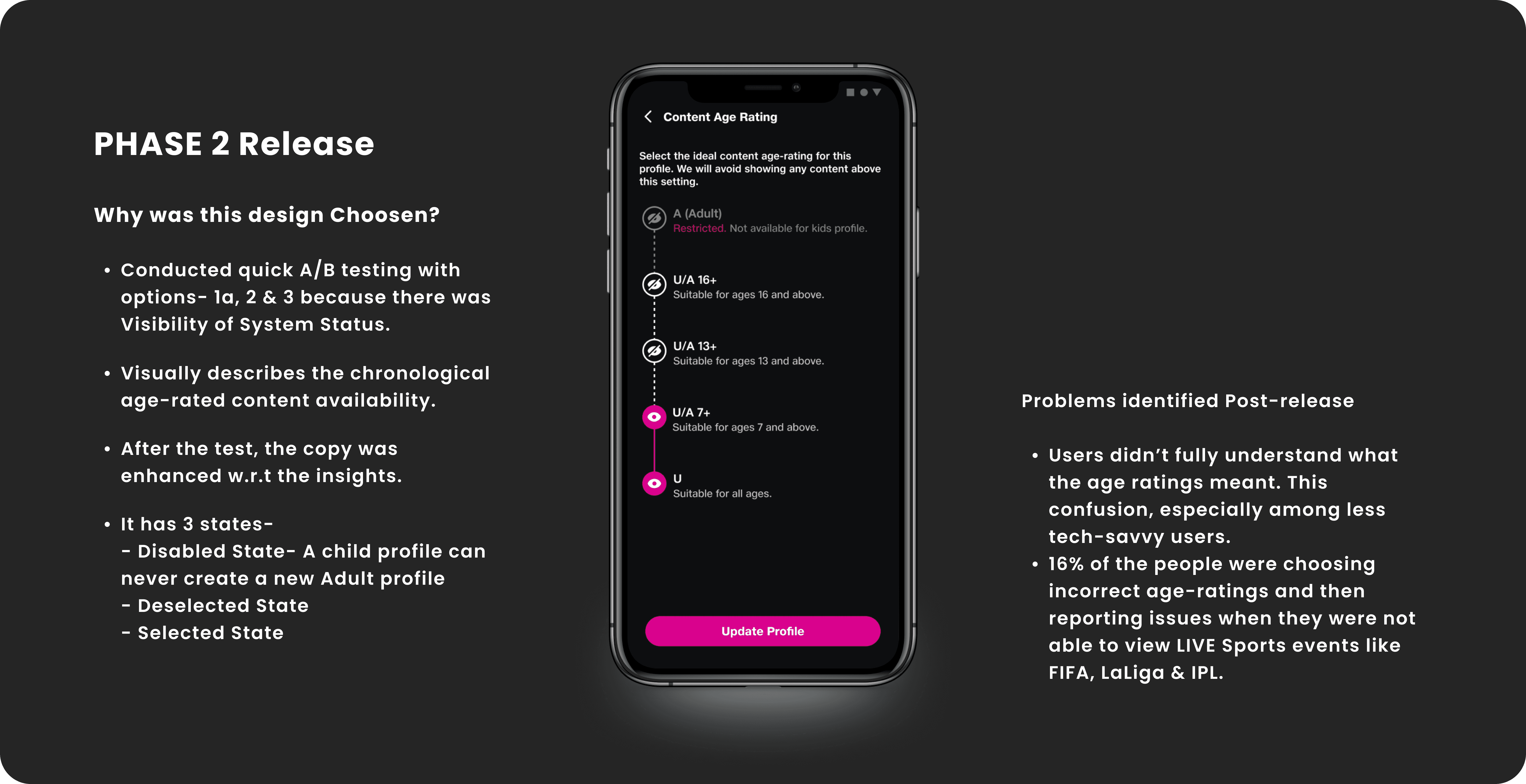 During beta testing, users occasionally entered the Kids profile from Who’s watching screen by mistake and couldn’t find content like Live Sports (because of age restriction on advertisements), leading to confusion, frustration and drop-offs. The main issue was “not identifying and entering correct profile”