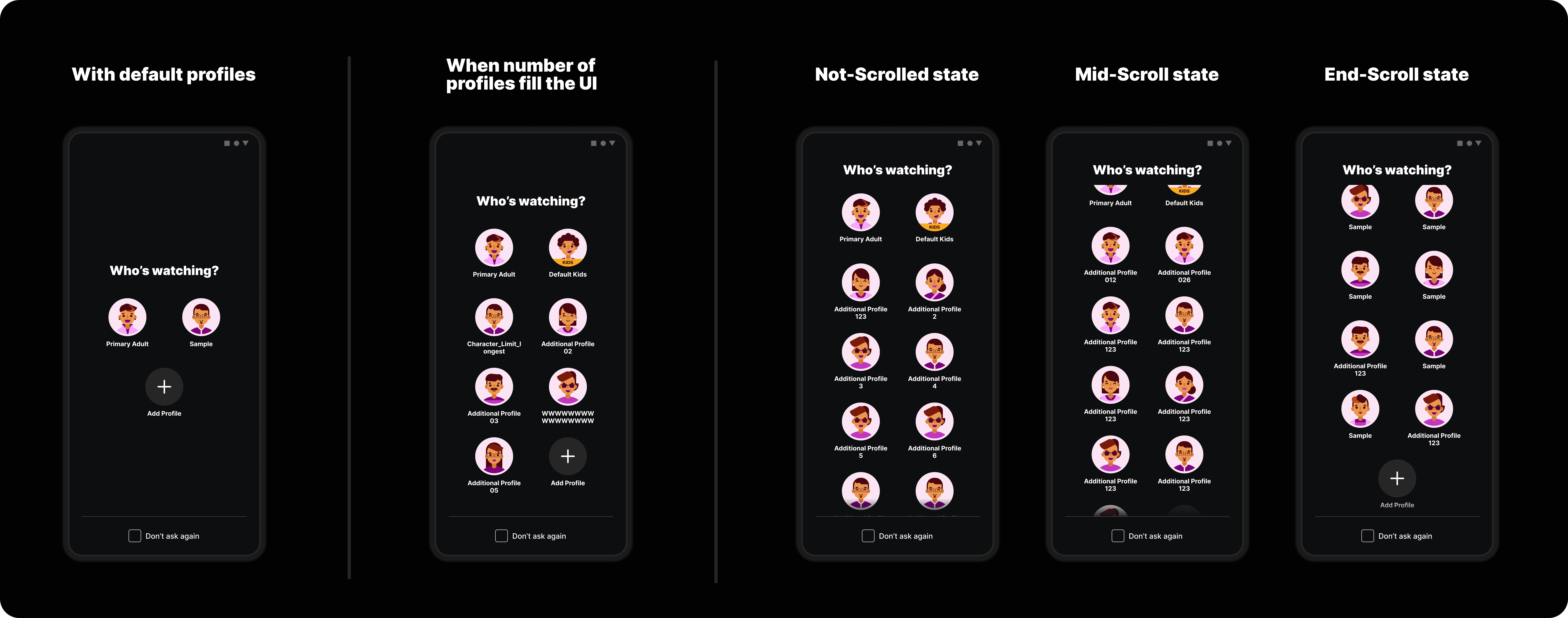 Alongside the core screens and flows, I also redesigned secondary touchpoints like the profile menu, kids profile protection,“ Don’t Ask Again” logic, editing profiles and the delete profile flow. All aimed at making profile management seamless across platforms.